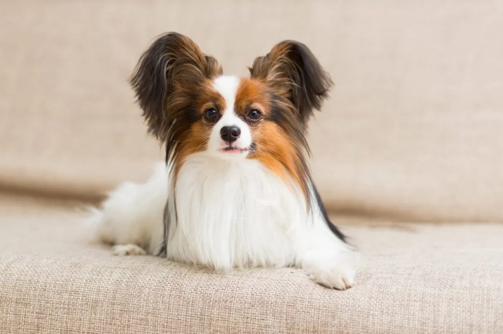 • Coat: Long, fine, silky, and straight. It is a single coat with no undercoat, making it low-shedding but requiring maintenance. The classic color is white with patches of any color. A drop-eared variety is called a Phalène (French for “moth”).